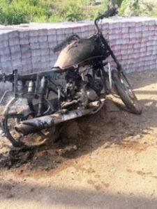 धमतरी/ भखारा में बुधवार की दोपहर बिजली आफिस के सामने सीजी 05 एई 0291 मोटर साइकिल से भखारा की ओर आ रहे देवरी निवासी युवक के मोटर साइकिल में अचानक आग लग गई और धू-धूकर जलकर राख हो गई। घटना की जानकारी होने पर पुलिस मौके पर पहुंची। वाहन को बचाने का प्रयास किया।