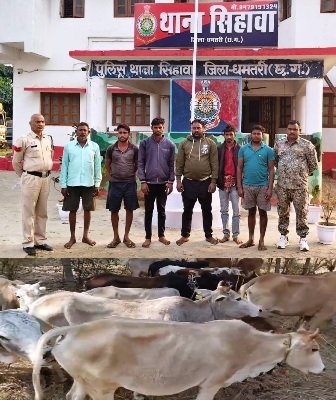 धमतरी/ एसपी धमतरी के निर्देश पर अवैध गतिविधियों के विरुद्ध चलाए जा रहे अभियान के तहत थाना सिहावा पुलिस ने अवैध गौ-तस्करी के एक गंभीर मामले का खुलासा करते हुए 6 आरोपियों को गिरफ्तार किया है। पुलिस ने तस्करी के लिए उड़ीसा ले जाए जा रहे 16 गौवंश (10 गाय, 4 बछड़े व 2 बछिया) को सुरक्षित मुक्त कराया।